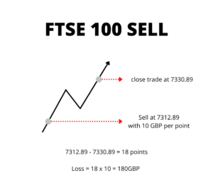 When you do financial spread betting on indices, you do so in terms of GBP per point. A point in trading is the last digit before the decimal. In the case of the FTSE100, if you were trading at a price of 7312.89, the ‘2’ is the point. So following this, if you were to sell short the FTSE100 at 7312.89 with a size of 10, betting that its price would go down, but unfortunately in a few days the price went up to 7330.89 – you would lose 18*10 = 180 GBP (excluding overnight costs). The price went 18 points against you.
